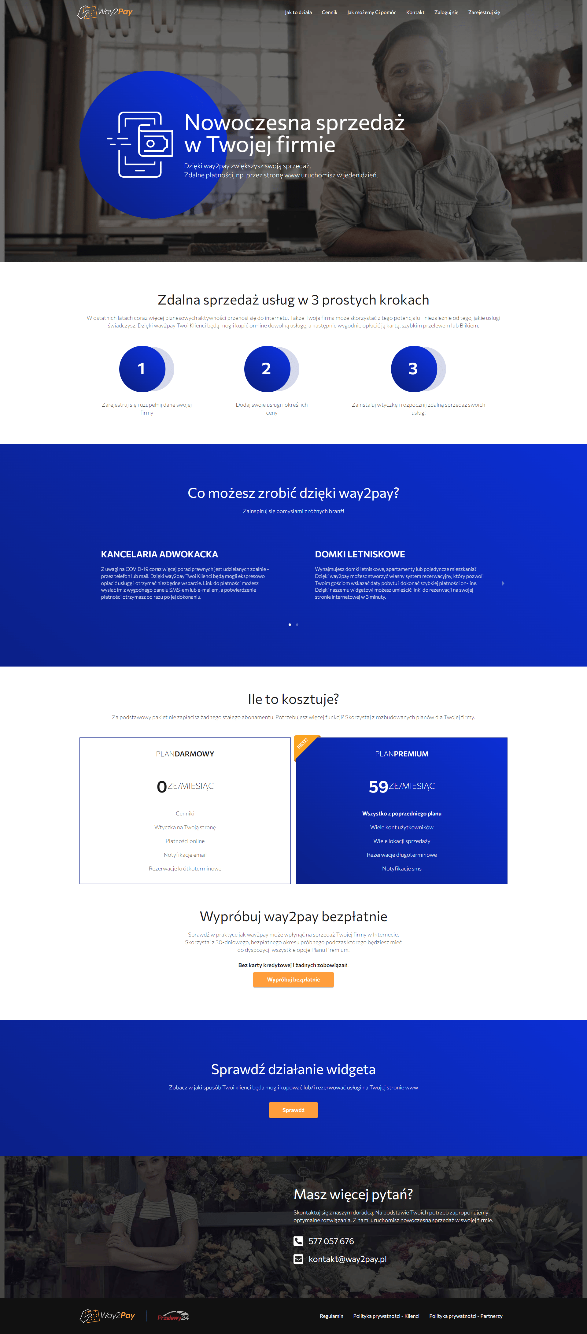 Projekt Way2Pay polegał na przygotowaniu narzędzia, dzięki któremu w łatwy sposób możliwe byłoby wdrożenie zdalnych płatności na stronie. Usługa wyświetla widget, który pozwala na wygodne zarezerwowanie i opłacenie wizyty lub zakup produktów przy użyciu karty, szybkiego przelewu lub Blika. Właściciel strony ma dostęp do panelu, w którym może zapoznać się ze statystykami transakcji, zobaczyć dostępność kalendarza oraz zarządzać ofertą swojej firmy.